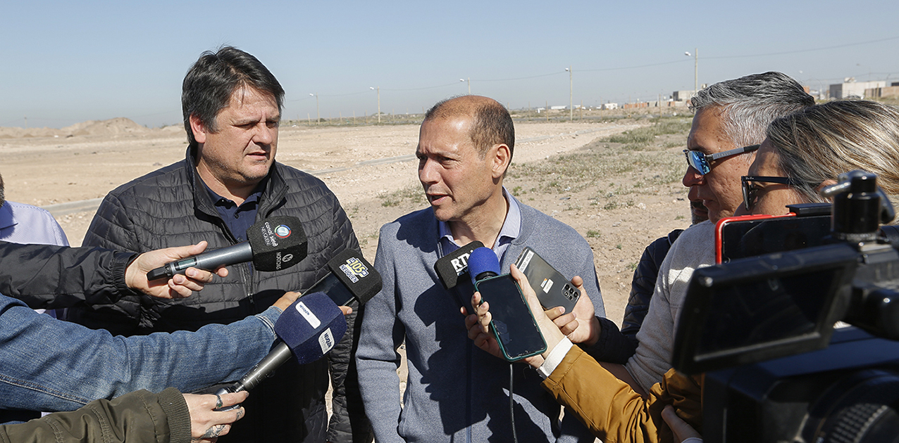 El gobernador Omar Gutiérrez y el intendente Mariano Gaido, junto a las familias beneficiarias, recorrieron esta mañana las obras de urbanización del Distrito 6, en la zona de la meseta de la ciudad de Neuquén, que cuentan con un 70 por ciento de avance.