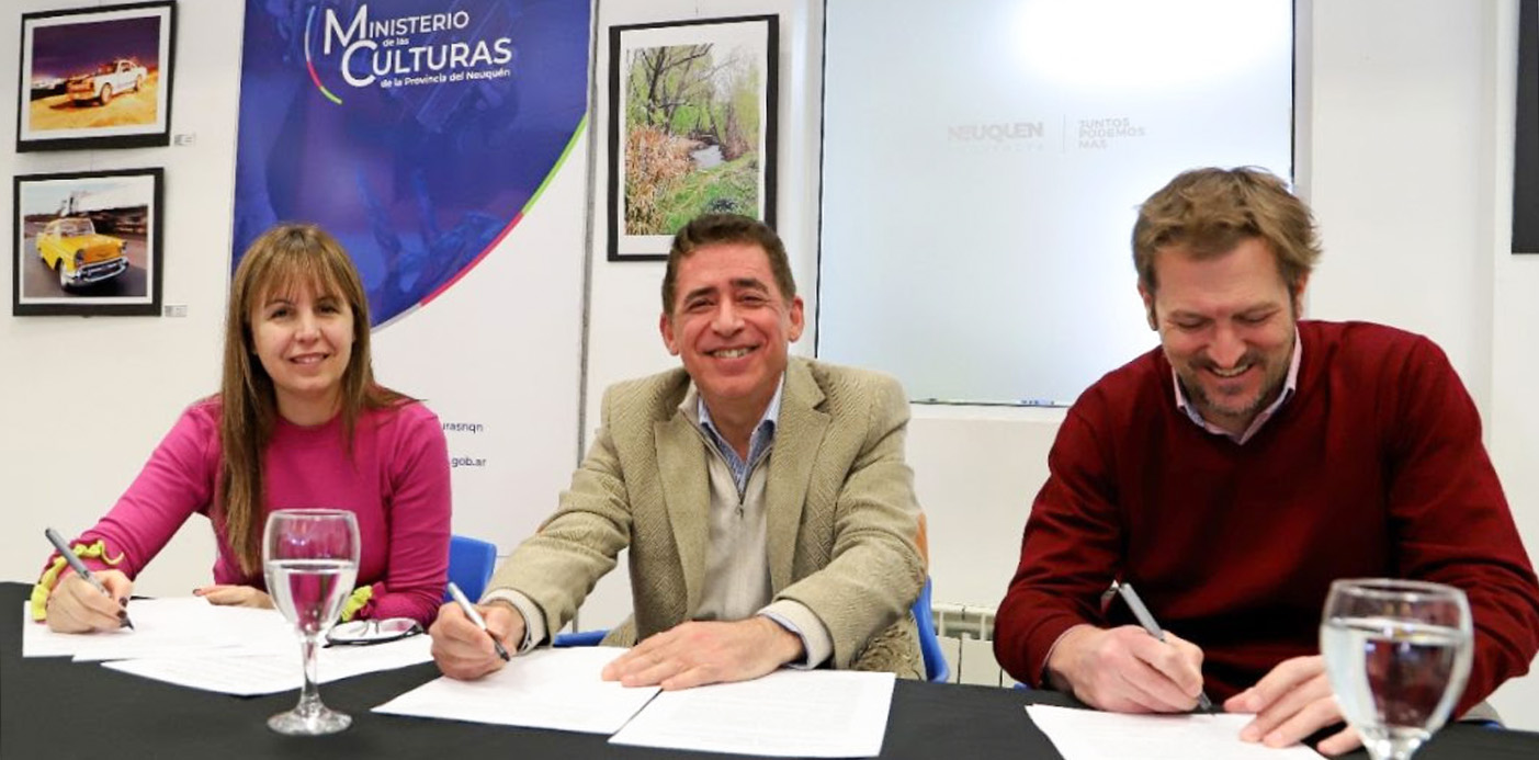 Se firmó esta mañana un convenio de cooperación entre el Ministerio de las Culturas, la Secretaría de Planificación y Acción para el Desarrollo (COPADE) y el Centro de la Pequeña y Mediana Empresa – Agencia de Desarrollo Económico del Neuquén (Centro PyME ADENEU), para implementar un ciclo de capacitación destinado a emprendedoras y emprendedores neuquinos en temáticas relacionadas con la formación y la gestión de emprendimientos culturales y creativos.