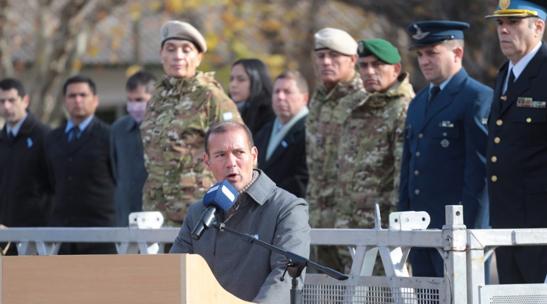 El gobernador Omar Gutiérrez participó esta mañana del acto por el 212º aniversario del Ejército Argentino, junto al segundo comandante de la Sexta Brigada de Montaña, Pablo Conforte y veteranos de Malvinas que se hicieron presentes en el Batallón de Ingenieros de Montaña 6, ubicado en la ruta nacional 22.