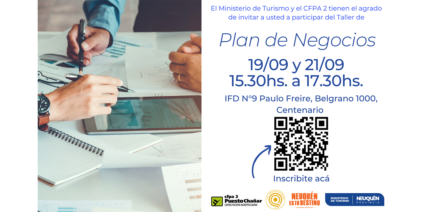 El ministerio de Turismo, la municipalidad de Centenario y el Centro de Formación Profesional Agropecuaria Nº 2 (CFPA 2) invitan a participar de la capacitación en Plan de Negocios destinada a todas aquellas personas que tengan su emprendimiento ya en funcionamiento o estén por comenzar sus proyectos vinculados a la actividad turística.