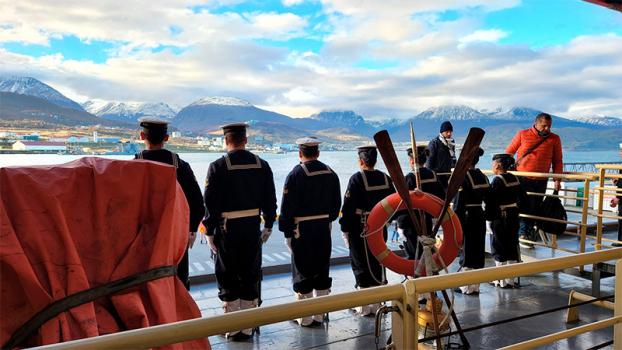 La comitiva de veteranos, militares y funcionarios encabezada por el ministro de Defensa, Jorge Taiana, embarcó en el rompehielos «Almirante Irizar» este domingo pasadas las 15 en la ciudad fueguina de Ushuaia con el objetivo de llegar al punto 55°24′S 61°32′O, a unos 160 kilómetros al sur de la Isla de los Estados, el lunes antes de las 16, horario en el que se cumplirían 40 años del impacto de los torpedos británicos en el buque argentino.